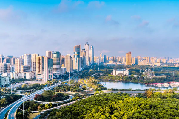 海南??趪Q(mào)CBD和濱海立交橋高視角建筑風(fēng)光。來源:視覺中國