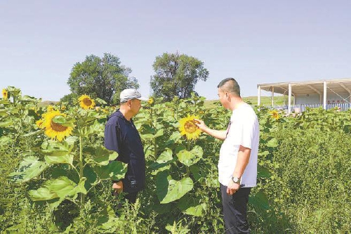 薛志龍(右)和村民一起查看向日葵生長(zhǎng)情況。