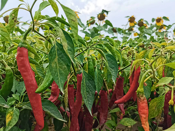 “從播種的時(shí)間來(lái)講,小麥要比辣椒早播1至2個(gè)月。小麥長(zhǎng)高時(shí),麥穗頂端和辣椒苗頂端存在的空間差,使得兩種作物能夠同時(shí)吸收陽(yáng)光。而當(dāng)辣椒掛果需要充足通風(fēng)時(shí),小麥已經(jīng)成熟收割。油葵具有生長(zhǎng)期短、耐寒性強(qiáng)、種植效益高的特點(diǎn),是小麥?zhǔn)崭詈髲?fù)種的理想作物?!卑锥鳚山榻B,小麥套辣椒復(fù)種油葵的模式符合當(dāng)?shù)厣a(chǎn)實(shí)際,在當(dāng)?shù)厣袑偈讋?chuàng)。