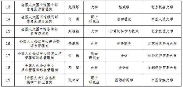 根據(jù)《全國人大機(jī)關(guān)直屬事業(yè)單位2023年度公開招聘工作人員公告》,經(jīng)過筆試、面試、考察、體檢等程序,確定張舒雅等19名同志為擬聘用人員(按職位及姓氏筆畫排序)。具體如下: