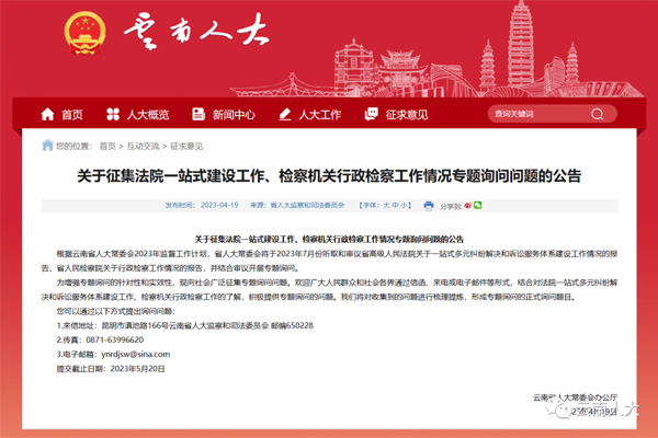 云南人大網(wǎng)發(fā)布向社會(huì)廣泛征集關(guān)于法院一站式建設(shè)工作、檢察機(jī)關(guān)行政檢察工作情況專題詢問(wèn)問(wèn)題的公告。