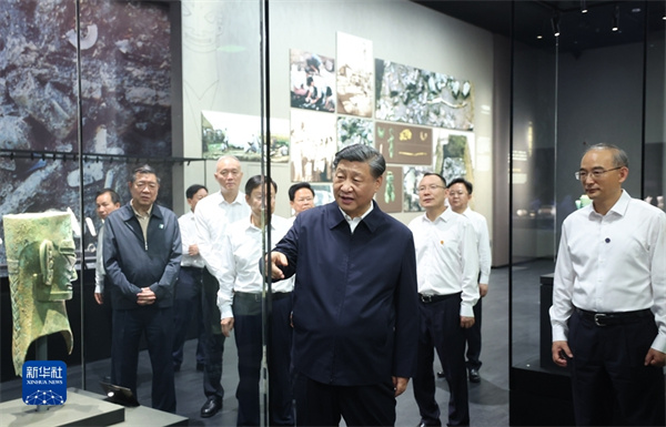 位于德陽市廣漢市西北鴨子河南岸的三星堆遺址,代表了數(shù)千年前的古蜀文明面貌和發(fā)展水平,是同時(shí)期長(zhǎng)江流域文化內(nèi)涵最豐富、面積最大的都城遺址。26日下午,習(xí)近平來到三星堆博物館新館,參觀“世紀(jì)逐夢(mèng)”、“巍然王都”、“天地人神”等展陳,了解三星堆遺址發(fā)掘歷程和古蜀文明成果。在三星堆博物館文物保護(hù)與修復(fù)館,習(xí)近平走進(jìn)文保修復(fù)工作區(qū),仔細(xì)察看文物保護(hù)修復(fù)工作流程細(xì)節(jié)和最新技術(shù),同現(xiàn)場(chǎng)工作人員親切交流。習(xí)近平指出,三星堆遺址考古成果在世界上是叫得響的,展現(xiàn)了四千多年前的文明成果,為中華文明多元一體、古蜀文明與中原文明相互影響等提供了更為有力的考古實(shí)證。文物保護(hù)修復(fù)是一項(xiàng)長(zhǎng)期任務(wù),要加大國(guó)家支持力度,加強(qiáng)人才隊(duì)伍建設(shè),發(fā)揚(yáng)嚴(yán)謹(jǐn)細(xì)致的工匠精神,一件一件來,久久為功,做出更大成績(jī)。習(xí)近平代表黨中央,對(duì)三星堆博物館新館的落成使用表示熱烈祝賀,向廣大考古工作者表示衷心感謝和崇高敬意!
