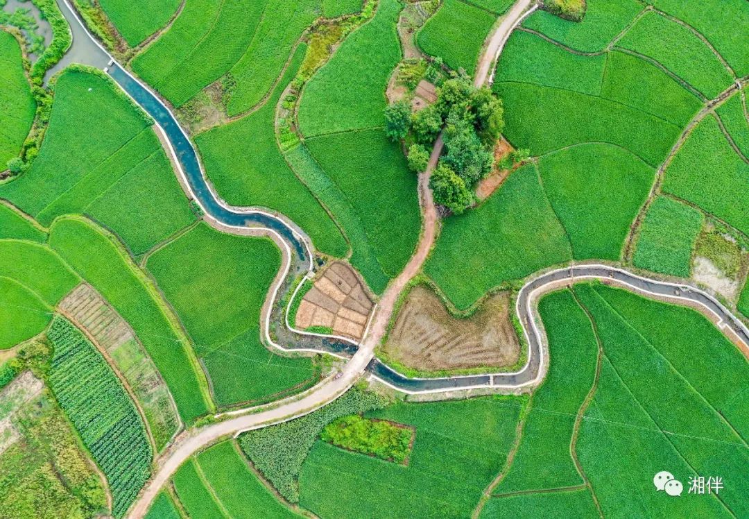 道縣富塘街道塘背村,灌溉渠蜿蜒在稻田中。